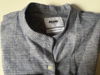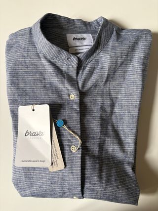 Camisa de manga larga de la marca Brava Fabrics, confeccionada en algodón orgánico. - Diseño de rayas finas en azul y blanco. - Cuello mao. - Cierre de botones. - Etiqueta de Sustainable apparel design incluida.