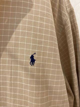 Camisa original, modelo "Yarmouth", en talla 17 ½ (que equivale a una XXL grande). Está confeccionada en 100% algodón de alta calidad con un diseño clásico de cuadros pequeños en tonos beige y blanco. Incluye el emblemático logotipo del jugador de polo bordado en color azul marino en el pecho y un cuello con botones (button-down). Se encuentra en excelente estado, sin señales de desgaste, siendo una prenda muy cómoda y elegante, ideal tanto para un estilo profesional como para un look diario sofisticado.