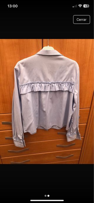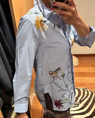 Camisa de rayas azul y blanco con bordados florales y pájaros, talla XS, Zara. Composición: 85% poliéster y 15% algodón.