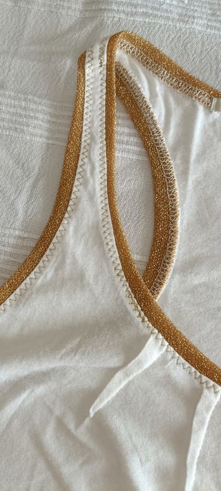 Top,camiseta beige con detalle en dorado en todo el contorno,espalda nadadora, tiene unas pinzas en escote,,tallaM,muy poco usada