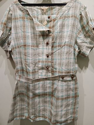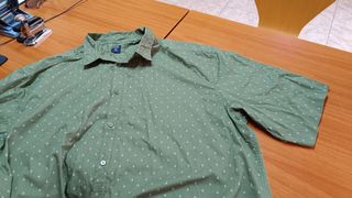 Camisa de manga corta. Talla M. Fabricación española. 65% poliester y 35% algodón Medidas: de sisa a sisa 57cm / largo 74cm / largo de manga desde el hombro 25cm / ancho de manga 19'5cm. Nueva con etiqueta