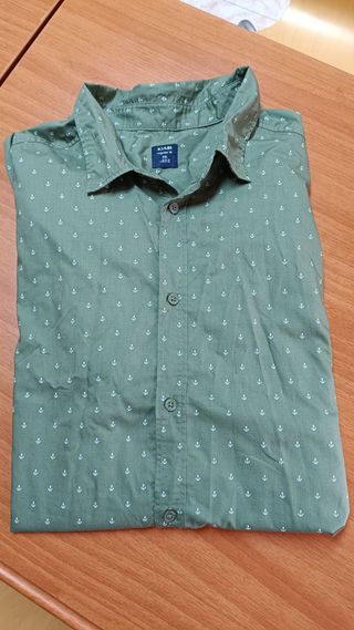 Camisa casual de la marca Jack & Jones. Diseño: Tono kaki oscuro con un estampado sutil de siluetas de pájaros en relieve. Tejido: Algodón. Cuello con botones. Estado: Muy buen estado, la vendo por cambio de talla (se me ha quedado pequeña de espalda y pecho). Estilo: Queda genial con vaqueros o pantalones chinos para un look de diario.