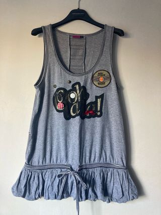 Camiseta larga sin mangas en color gris. También podría considerarse un vestido muy corto. Zona inferior con volumen. Decorada con letras de purpurina, parche y pines. Con lazo en la parte interior que permite apretar o aflojar la prenda. Talla como una M. Mide unos 73 cm de largo,42 cm de sisa y 29 cm de hombros. 100% algodón.