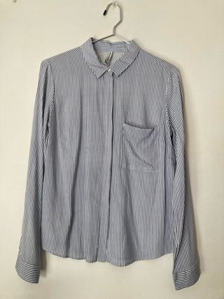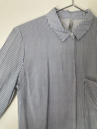 Blusa blanca a rayas azules con abotonadura decorativa en la parte de atrás. Muy mona y de tacto agradable. Talla XS, marca Bershka. No sé qué composición tiene, pero parece algodón. En muy buen estado.