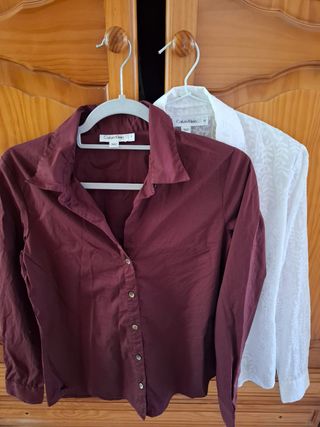 Dos preciosas camisas , talla S. Ideales para cualquier ocasión. - Una camisa blanca con estampado de hojas, de textura ligera y delicada. - Una camisa burdeos de algodón, elegante y cómoda.