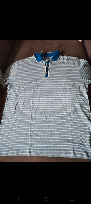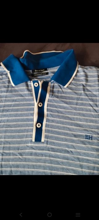 Preciosa camisa polo de la marca Pedro del Hierro. Es de color azul con rayas blancas. - Está confeccionada en algodón mercerizado. - Tiene un diseño a rayas. - El cuello y la tapeta son de color azul marino con ribetes blancos.