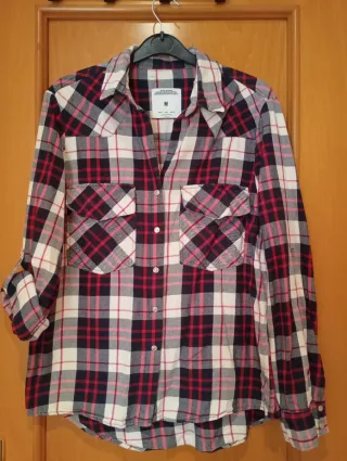Camisa Billabong color crema 100% algodón con patrón de rayas azules y rojas. Está nueva, me la he puesto una única vez antes de que se me quedase pequeña.