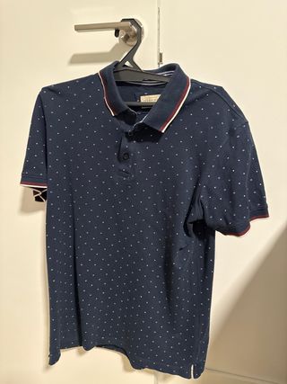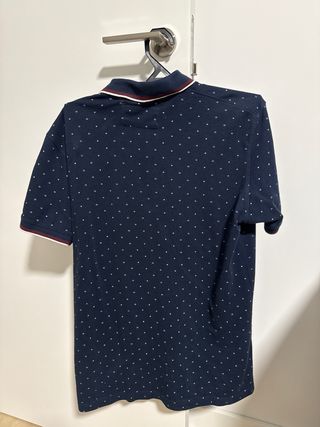 Preciosa camisa polo de la marca Sfera, en color azul marino y talla S (34-36/44-46). Es una prenda elegante y en buen estado. - Diseño de lunares blancos. - Cuello y puños con ribetes en burdeos y blanco. - Tejido de algodón suave.
