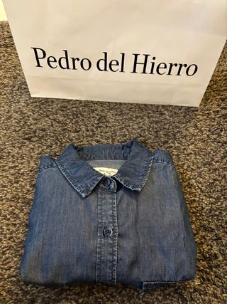 Camisa vaquera de la marca Pedro del Hierro. - Diseño clásico con botones. - Cuello camisero. - Tejido tipo denim pero mucho más fino y ligero. 100% algodón. Aynque es una talla L es muy pequeña, corresponde a una M o incluso una S. Por eso está prácticamente sin usar. - aspecto deshilachado en la parte inferior