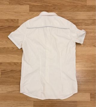 Elegante camisa blanca con detalles en contraste. - Cuello con botones a presión. - Puños con estampado. - Logo bordado en la parte frontal. Camisa blanca de algodón Marca H Muy poco uso, está perfecta. Muy buena calidad. No pone la talla pero es una 38