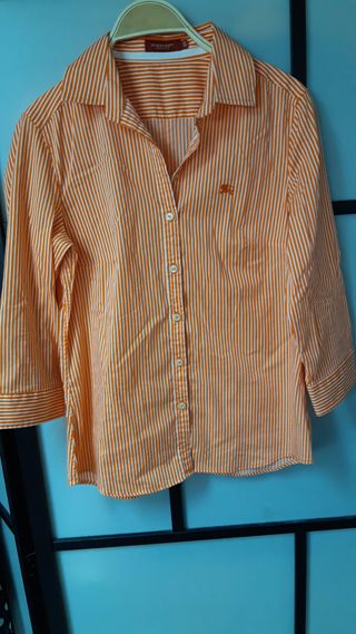 Camisa mujer marca Burberry London, estampado a rayas verticales color blanco y naranja, manga 3/4, 78 % algodón, talla 40, en muy buenas condiciones. Se puede enviar o recoger en Tienda Solidaria Piel de Mariposa MARBELLA C/Jacinto Benavente 12 (+ info en la última foto).