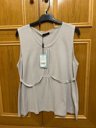 -Precioso top de punto. -LASSERRE -Talla XL -NUEVO con etiquetas. - Color gris neutro. - Diseño sin mangas. - Detalle de fruncido en el escote y delantero. -Escote redondo. - Cinturón fino en el delantero. -Composición: 100 % algodón. -Medidas: axila a axila 52 cm , ancho de bajo 64 cm y largo 66 cm. Se acopla muy bien al cuerpo. -Precio original 85 e