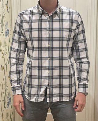 Camisa de manga larga con un diseño a cuadros tipo escoceses. Ligeramente entallada y con bolsillos en el pecho. 100% algodón. Detalle coderas y botones para recoger las mangas. Prácticamente nueva