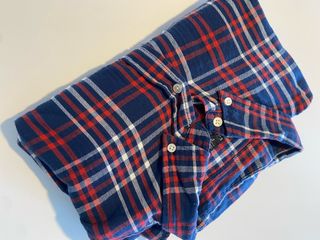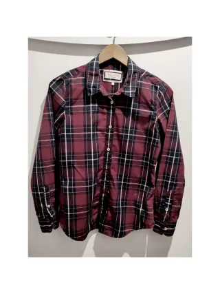 Camisa de Cuadros de Tommy Hilfiger para Mujer. Manga Larga con Empuñaduras con abertura y Abotonadas. Botones a media manga para remangar y abotonar. Cuello con Solapas. Cierre con Abotonadura Frontal Central completa. Dos Botones de Repuesto. Dos Bolsillos Frontales Superiores con Solapas y cierre con botón. Detalles con el logotipo de la marca en parte frontal superior izquierda y trasera superior central. Detalle de nombre de la marca en bajo derecho central. Diseño Estampado de Cuadros Azul Marino, blanco y rojo. -Marca: Tommy Hilfiger. -Composicion: 100% Algodón. -Color: Varios. -Talla: XL. 14. -Estado:Prácticamente Nueva