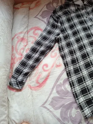 Camisa de cuadros con un diseño moderno y juvenil. - Manga larga. - Cuello mao. - Cierre de botones. - Corte babydoll con vuelo. De la marca Amichi. Talla S. Camisa cuadros azul marino y blanco. Algodón. Puesta 2 veces, en perfecto estado.