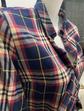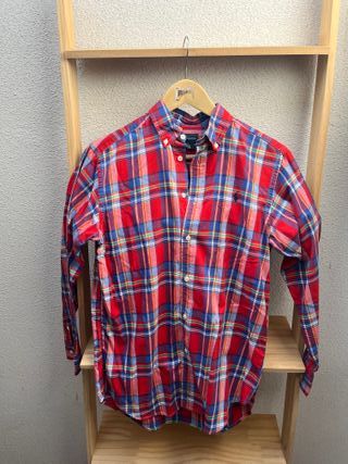 Camisa de manga larga con estampado de cuadros. - Cuadros en tonos rojos, azules y verdes. - Cuello abotonado. - Talla XS.