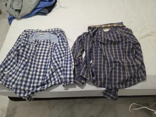Lote de dos camisas con estampado de cuadros. - Una camisa es de cuadros grandes en azul y blanco. - La otra camisa es de cuadros finos en azul y beige.