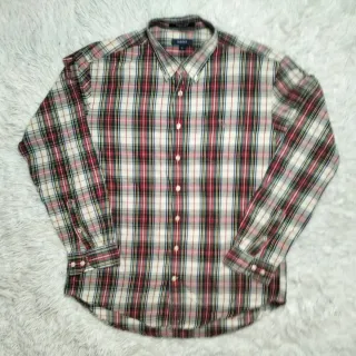 Camisa de manga larga con un diseño de cuadros sutil. - Material: Algodón - Diseño: Cuadros finos en rojo y azul sobre fondo blanco.