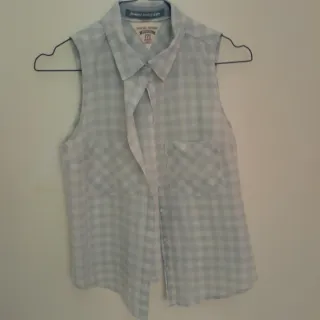 Camisa de verano sin mangas con estampado de cuadros. - Cuello camisero. - Dos bolsillos en la parte delantera. - Cierre de botones. - color blanco y azul celeste