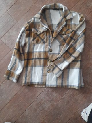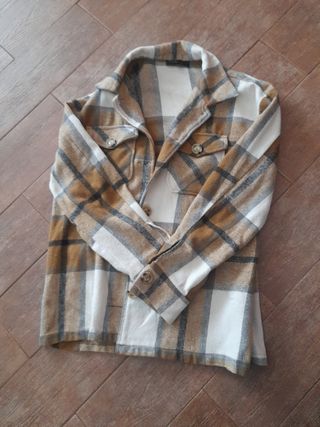 Camisa de manga larga con un diseño a cuadros en tonos beige, azul y marrón. Presenta detalles en ante o pana en la zona de los bolsillos y el cuello. - Cuello camisero. - Cierre de botones. - Dos bolsillos en el pecho con botón, que no cierran, sólo de adorno. Largo máx 75cm. Ancho entre axilas, 53cm.