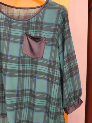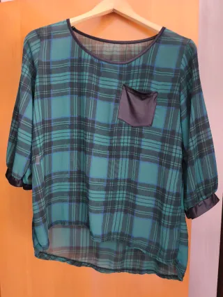 Camisa de cuadros con cuello - Diseño de cuadros en azul y verde azulado. - Cuello de camisa clásico.