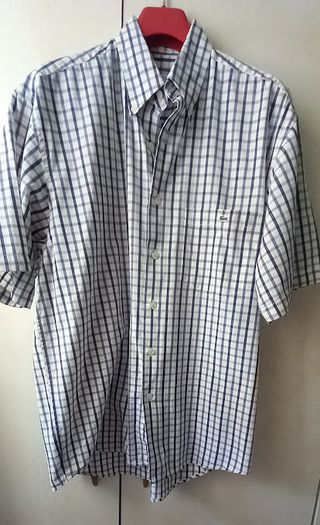 Camisa de manga corta Lacoste Sport original en talla 42 (talla L/XL aprox.). Presenta un diseño de cuadros en tonos azules, beige y blanco, con el emblemático cocodrilo verde bordado sobre un bolsillo funcional en el pecho. Cuenta con un cuello abotonado que mantiene la forma y un tejido ligero y fresco, perfecto para el verano. La prenda está muy bien conservada y destaca por su estilo deportivo pero formal, característica propia de la línea Sport de Lacoste.