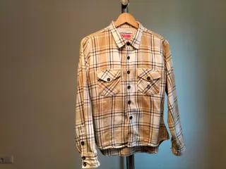 Camisa de cuadros de manga larga con cremallera frontal Amundsen Sport en talla L nueva a estrenar. Botines y cremallera metálicos, tejido grueso y de gran calidad. - Diseño a cuadros en tonos beige y marrón. - Cuello camisero. - Cierre de cremallera.