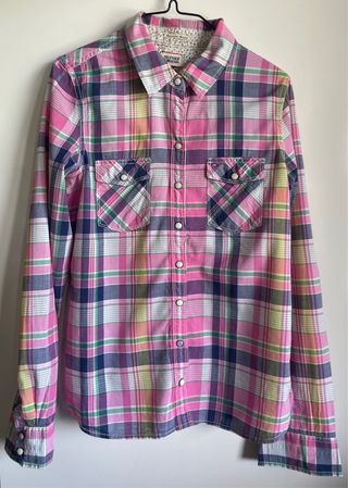 Camisa de manga larga con un diseño a cuadros vibrante. - Cuello camisero. - Bolsillo en el pecho con logo bordado. - Cierre de botones. - Puños abotonados. - Es una talla S -XS yo tengo una M y me queda pequeña al pecho