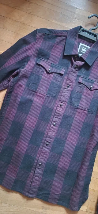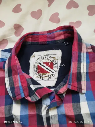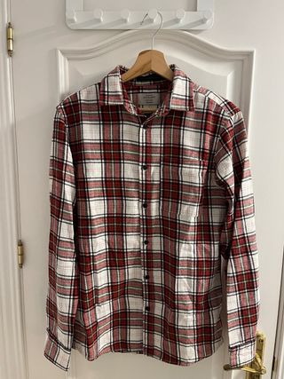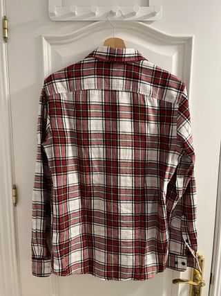 Camisa de manga larga con un diseño de cuadros clásico en rojo, blanco y negro. Uno de los botones de la manga está partido pero se puede sustituir fácilmente.