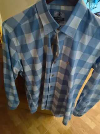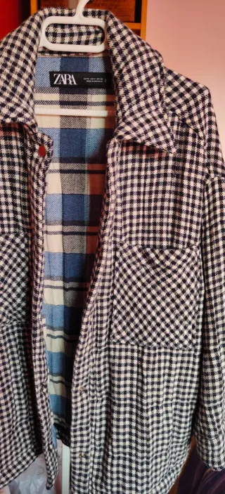 Camisa de cuadros con forro interior de cuadros en tonos azules. - Diseño de cuadros pequeños en negro y blanco. - Bolsillos en la parte delantera. - Cierre de botones. - Sin usar. La he tenido guardada porq contaba con usarla y al final no.