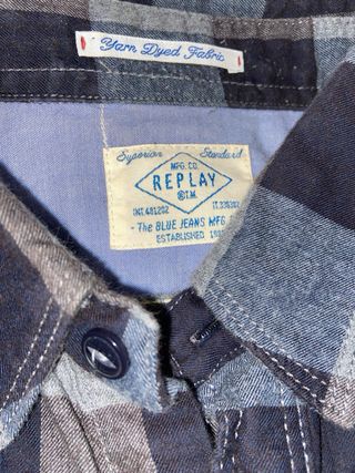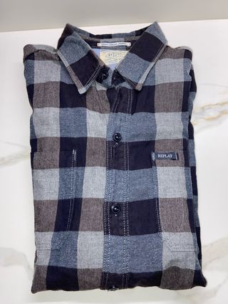 Camisa de cuadros de la marca Replay en talla M. Presenta un diseño clásico y versátil. - Patrón de cuadros en tonos negros y grises. - Cierre de botones. - Bolsillo en el pecho con etiqueta de la marca.
