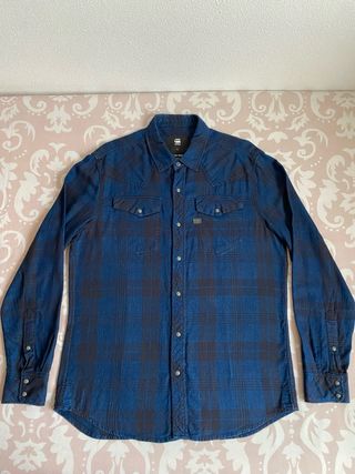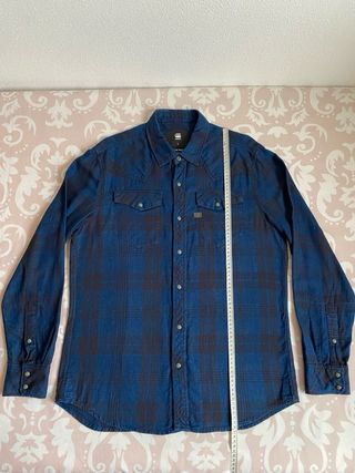 Camisa de Franela a cuadros G-Star RAW Tacoma Shirt, Original, Nueva sin etiquetas, color azul y negro. Talla ( L ), mide 76 centímetros de largo desde el hombro hasta el bajo de la camisa y 56 centímetros de ancho de axila a axila, etiqueta de la marca de piel cocida en bolsillo izquierdo, dos bolsillos en pecho con broches metálicos, cremallera y puños de broches metálicos, tejido 100% algodón, muy bonita cómoda y elegante