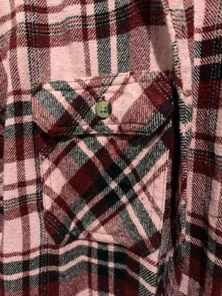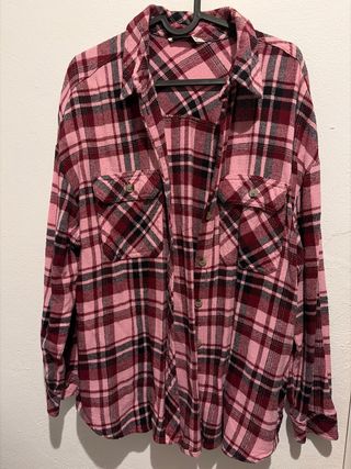 Camisa de franela con un diseño a cuadros en tonos rosas y grises. Es una prenda cómoda y versátil. - Cuello camisero. - Cierre de botones. - Bolsillo en el pecho.
