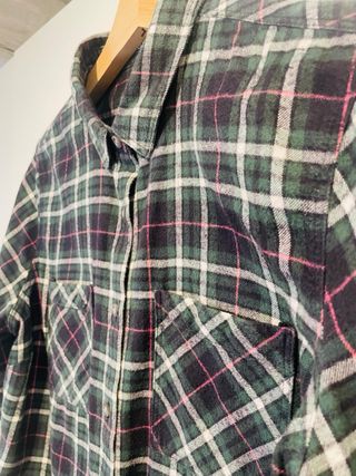 Camisa de franela de cuadros tipo leñador en color verde oscuro y negro. Se abrocha con botones y tiene 2 bolsillos funcionales delanteros también con botón. Es relaxed fit y abrigada. Se puede usar también como sobrecamisa. Muy bien cuidada, es de algodón. Queda genial. Dejo las medidas a continuación para que puedas comparar con una prenda tuya: Hombros: 59 cm Sisa: 67 cm Lago: 74 cm Escucho ofertas. Envío en 24 horas! ☺️🫶🏻