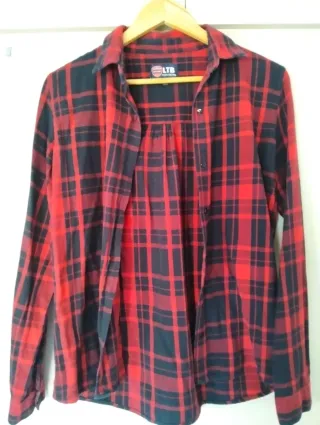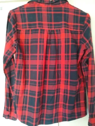 Camisa de franela con estampado de cuadros rojos y negros, ideal para el invierno. - Cuello clásico. - Cierre de botones. - Bolsillo en el pecho con logo bordado. Tiene algunas marcas que se frota y se eliminan de pintura. Bajo el precio por eso, pero en si la camisa está perfecta.