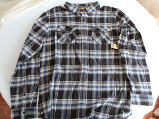 Sobrecamisa de franela, abrigada 45% lana, talla L nueva a estrenar. - Cuadros en negro, naranja y gris. - Cierre de botones. - Dos bolsillos en el pecho.