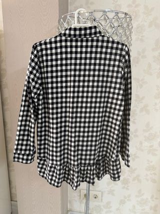 Camisa de franela en cuadros Vichy blancos y negros. Con precioso volante en el bajo. Es una talla XS aunque no posee la etiqueta. Está en perfecto estado.