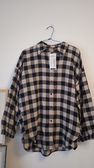 Camisa de franela suave a cuadros negra con botones y mangas largas de Bershka. Talla M Tela suave. Material: 100% algodón. Largo: 29 cm. desde el cuello hasta el dobladillo Hombros a Hombro: 19 cm Sisa a sisa : 19 cm.
