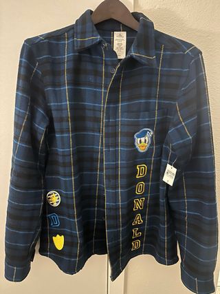 Camisa de franela con estampado a cuadros de Donald. - Diseño a cuadros azul marino y negro con detalles amarillos. - Parches de Donald y sus pies. - Nombre DONALD bordado en la parte delantera.