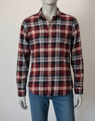 Vendo camisa de cuadros de la marca Hollister, original. Es de un tono granate/burdeos precioso combinado con blanco y detalles en negro. El tejido es tipo franela, muy suave al tacto y perfecto para entretiempo o invierno. • Corte: Boyfriend Fit (queda ligeramente holgada y cómoda, estilo relajado). • Talla: XS (al ser estilo boyfriend, podría servir para una S si prefieres que quede más entallada). • Detalles: Dos bolsillos frontales con solapa, botones con efecto carey y bajo redondeado (más larga por detrás). • Estado: Muy buen estado, muy cuidada. Sin manchas ni roturas. Ideal para llevar abierta con una camiseta debajo