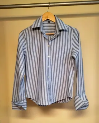 Preciosa camisa de la marca Claudietta. Es una prenda elegante y cómoda, ideal para cualquier ocasión. - Diseño de rayas verticales en tonos azules y blancos. - Tejido suave y ligero. - Cierre de botones.