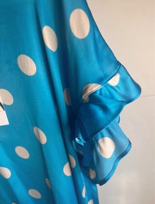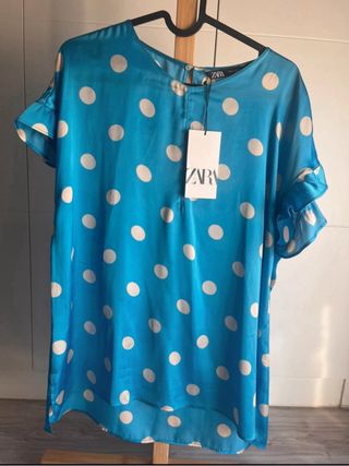 Camisa de la marca Zara con un elegante diseño de lunares blancos sobre fondo azul. Precio original: 29,95€ - Diseño de lunares. - Mangas con volantes. - Cuello redondo.