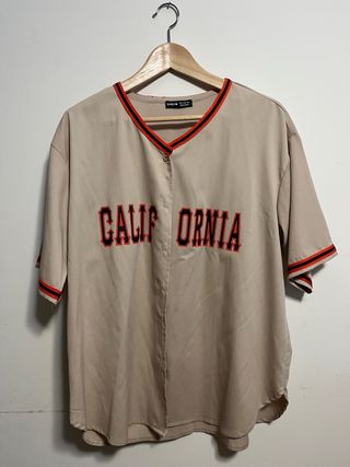 Camisa estilo beisbolera de la marca SHEIN con un diseño inspirado en California. Es una prenda cómoda y con un estilo deportivo. - Cuello en V con ribete. - Mangas cortas con detalle de ribete. - Cierre de botones al frente. - Estampado CALIFORNIA en el pecho.
