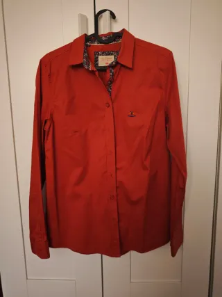 Preciosa camisa entallada de la marca La Española en un color teja/terracota muy favorecedor. Es una prenda de excelente calidad, ideal para un look casual elegante o estilo campero/ecuestre. Marca: La Española (Original). Precio en tienda : 59,99 euros. Talla: 40 (equivale a una M). Corte: Slim fit femenino con pinzas que realzan la figura. Estado: Impecable, como nueva. Detalles que enamoran: Interior de cuello, puños y tapeta con estampado de flores tipo Liberty. Logo bordado en el pecho a contraste. Botones en color teja con borde melaza. Contiene el botón de repuesto de origen cosido a la etiqueta. Perfecta para comb