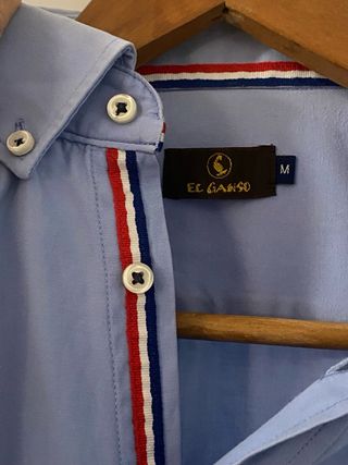 Camisa de manga larga de la marca El Ganso. - Cuello con botones. - Logo bordado en el pecho. - Puños abotonados. - Raya tricolor en la tapeta de botones.