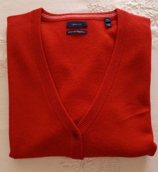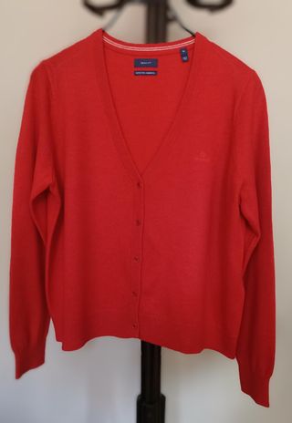 Cárdigan rojo de GANT confeccionado en 100% lana merino extrafina, presenta un diseño de corte normal, botones en la parte delantera y detalles de canalé en los puños y el bajo. Cuello redondo, un discreto logo de GANT bordado en la manga. Es una prenda clásica y atemporal, perfecta para llevar encima de una camisa o camiseta. Aunque no tiene etiqueta, está sin estrenar. Medidas: Largo 58 cm; Ancho espalda (sisa) 51 cm Talla XL LAS FOTOS FORMAN PARTE DE LA DESCRIPCIÓN Precio 45€ Todos mis artículos están cuidadosamente seleccionados y están en excelentes condiciones. Pueden realizar las preguntas que consideren necesarias
