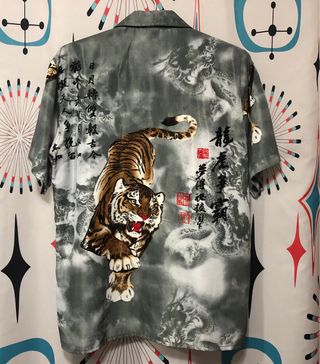 Camisa de manga corta con estampado de tigre y dragón. - Diseño oriental. - Cuello camisero. - Cierre de botones. - En perfecto estado , aunque marca una talla S es una L , tienes medidas en las fotos. - Tengo mas cosas en mi perfil.