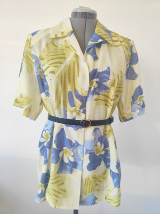 Camisa corta estilo tropical. El tejido es fino de hilo, en color blanco y con estampado en azul marino. Lleva nudo hecho por delante y goma a la cintura por la parte trasera para ajustarse mejor. Yo uso la talla S, pero cogí una L porque me apetecía que me fuera más suelta y amplia. Usada una vez, está como nueva.