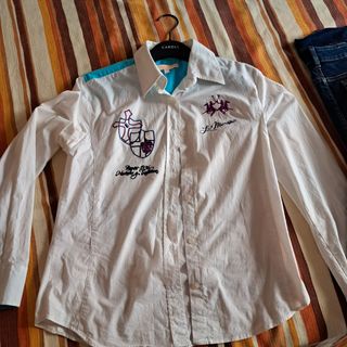 Camisa de manga larga puesto solo una vez, de la marca La Martina en color negro. Presenta un diseño con detalles gráficos y texto en la parte delantera. -Bordados en varias partes - Cuello clásico. - Cierre de botones. - Puños abotonados. - Detalles de rayas en los bajos.