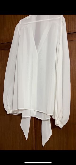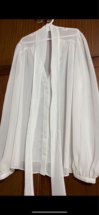 Elegante camisa blanca con un diseño vaporoso y detalles de lazada. - Tejido ligero y translúcido. - Cierre de botones en la parte frontal. - Mangas largas abullonadas con puños. - Cuello con lazada.
